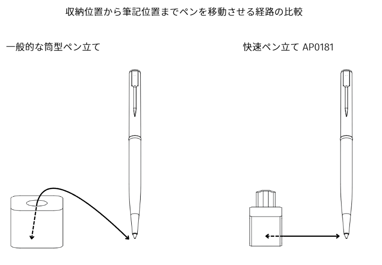 一般的な筒型ペン立てからペンを出し入れするにはペンを上下に動かす必要がありました。普段の筆記作業でこの動作を意識する人は多くありませんが、筆記が多くなるほどこの「動作のムダ」と「潜在的なコスト」が目立ってきます。